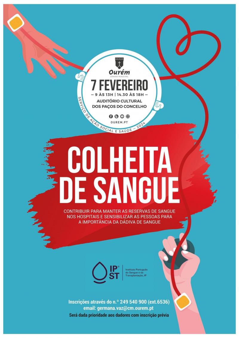 O auditório cultural dos Paços do Concelho, em Ourém, acolhe no dia 07 de Fevereiro, quarta-feira, uma colheita de sangue. A iniciativa decorre entre as 09h e as 13h e as 14h30 e as 18h e conta com a habitual colaboração do Instituto Português do Sangue e da Transplantação. Será dada prioridade aos dadores com inscrição prévia, que pode ser efectuada através do nº 249 540 900 (extensão 6536) ou do email germana.vaz@cm.ourem.pt