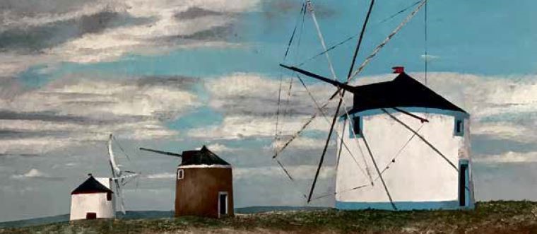 Imagens: Dois quadros do autor: "A Feira" (imagem recortada) e "Moinhos da Fazarga" + o cartaz da exposição no Posto de Turismo, com o quadro "A Feira" (CMO)