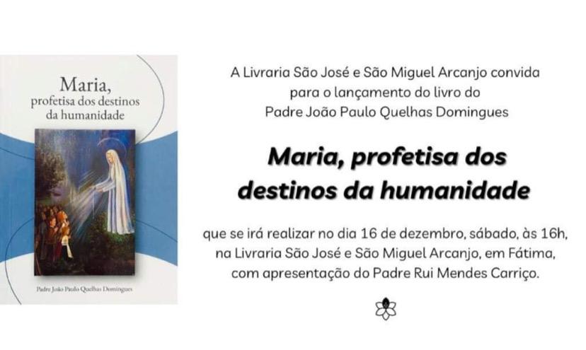 Sábado, 16 de Dezembro, o padre João Paulo Quelhas Domingues vai apresentar o seu livro “Maria, profetisa dos destinos da humanidade”, na Livraria São José e São Miguel Arcanjo, em Fátima. A apresentação estará a cargo do padre Rui Mendes Carriço. A iniciativa, agendada para as 16h, é aberta à população em geral.