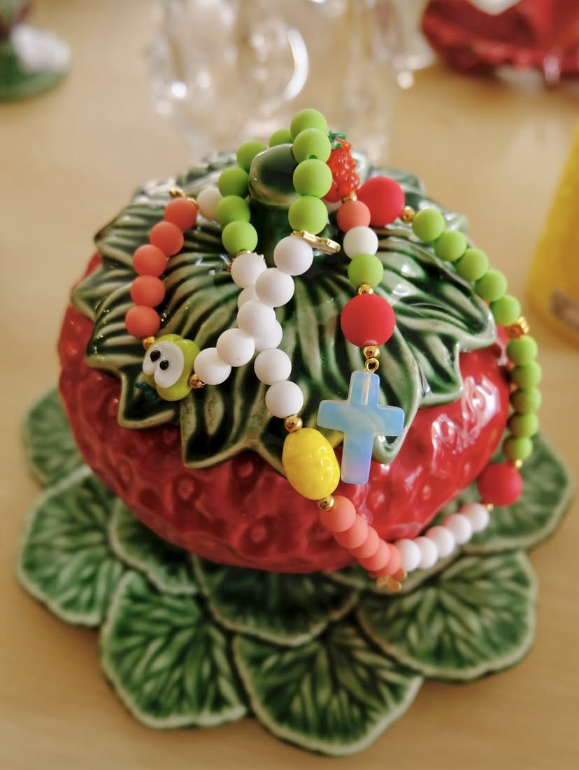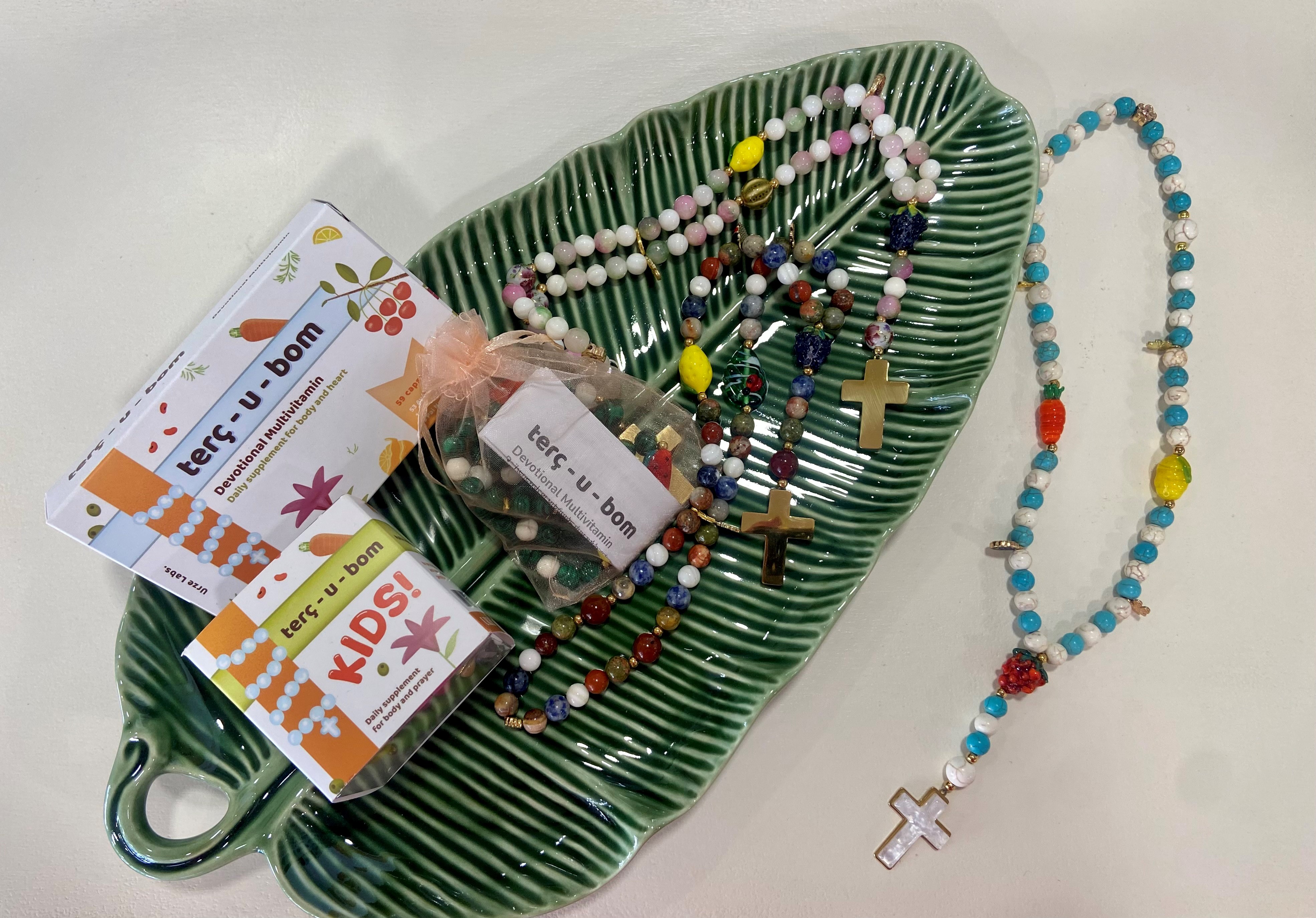 “Este é um projeto de mãe e filha”, começa por dizer a designer Margarida Rodrigues, que idealizou e criou juntamente com a sua mãe, Ana Abreu, este projeto. “Eu e a minha mãe somos bastante espirituais. Gostamos de passear por Fátima, e achamos que o artigo religioso existente é, de facto, muito bonito, mas é muito repetitivo e acaba por carregar uma certa seriedade. Nós não nos revemos muito nesse tipo de espiritualidade e religiosidade. Para nós, rezar é muito leve, é um ato doce, é um ato que nos traz paz. Nós até brincávamos: rezar é nutrir a alma, e daí veio a ideia de nutrição, pensámos: porque não brincarmos com a ideia dos frutos e dos vegetais e criarmos um multivitamínico devocional para as pessoas se nutrirem de dentro para fora?”, conta Margarida.